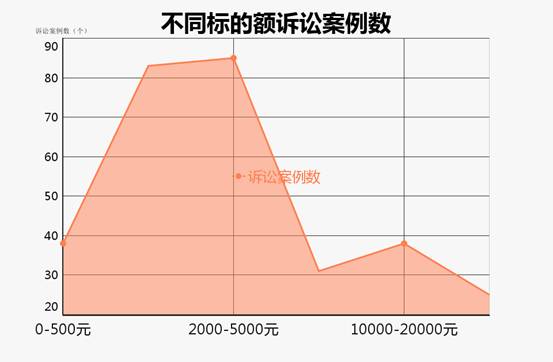 根据统计,争议标的最小金额为:11.9元,商品为个护化妆:套装指甲;争议标的最大金额为:209350元,商品为理财产品:金条。多数案件标的额集中在500-5000元这一区间。这一结论可以解释为当争议标的额达到一定数量时,当事人才会选择诉讼手段解决纠纷:如果商品价格在500元以下,诉讼成本过高,得不偿失,而超过5000元的大额商品交易数量较少,同时由于价格较高质量多有保证,产生纠纷数量相对较少。